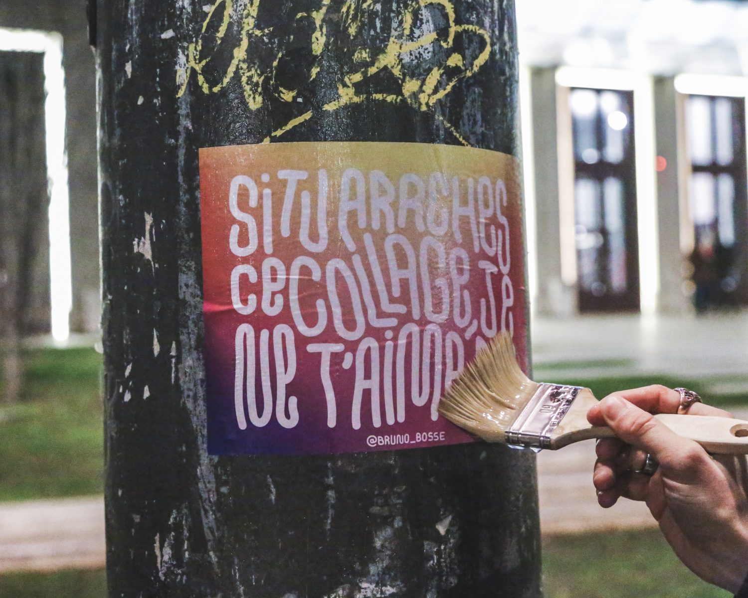Archives Si tu arraches ce collage, je ne t’aime pas. 2020/01 - TNS Message de paix par l'artiste Bruno Bosse. 1 Avenue de la Marseillaise, 67000 Strasbourg, France Itinéraire