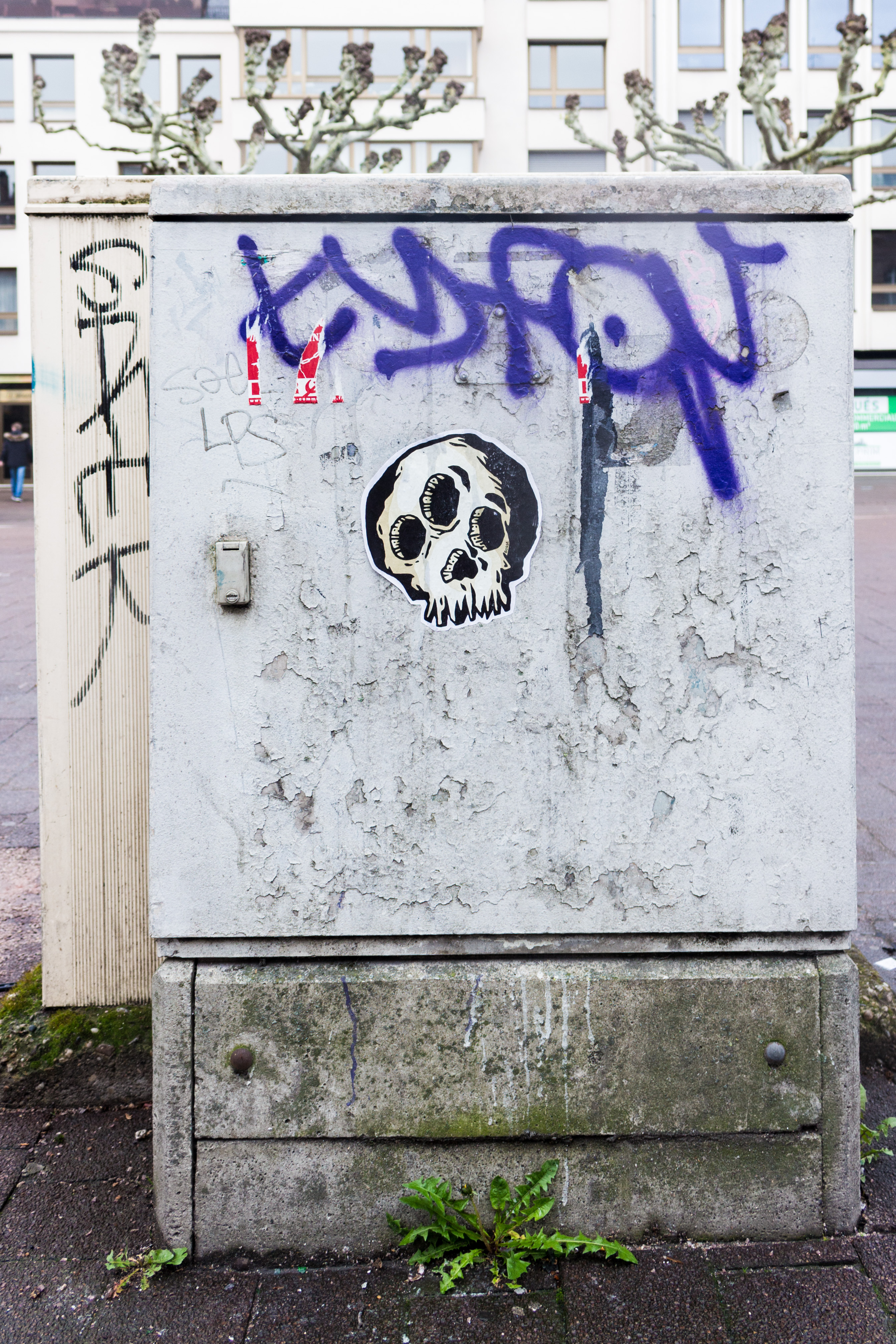 Collage Skull 2019/04 - Tram Broglie Illustration digital imprimée et collée sur un boité électrique près de l'arrêt de tram Broglie. Place Broglie, Strasbourg, France Itinéraire