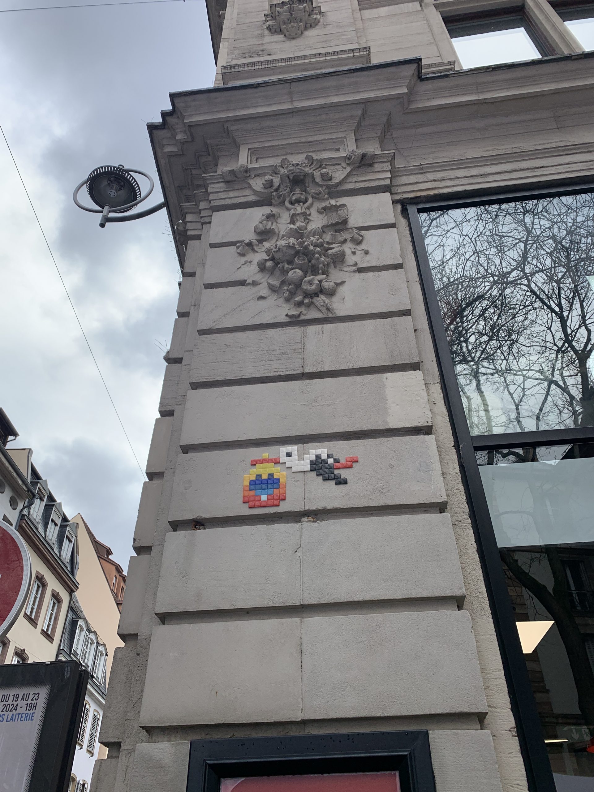 2024/03-Rue du vieux marché aux grainesŒuvre de Stork cigogne avec cœur bleu à l’angle des rues du vieux marché aux grains et des grandes arcades41 Rue des Grandes Arcades, 67000 Strasbourg, France