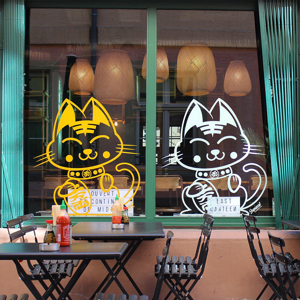 2019/06 - East Canteen, 2 place des Orphelins à Strasbourg Première collab’ avec l’un des restaurants préférés de Supacat à Strasbourg : le East Canteen, 2 place des Orphelins à la Krutenau. Deux Supa Maneki Neko de plus de 140 cm ont été posés sur deux vitres, un blanc et un jaune. 3 Place des Orphelins, 67000 Strasbourg, France Itinéraire