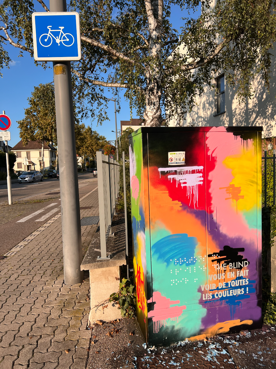 "Dans le cadre du festival Colors à Strasbourg, The Blind invite le public à une immersion chromatique et texturée, pensée pour les aveugles mais aussi pour les voyants. Ce graffiti se distingue par un mélange de techniques : des bombes aérosols créent des éclats de couleurs intenses et des coulures dynamiques, évoquant une explosion visuelle. La phrase, apposée en adhésif, rappelle avec ironie la perception des couleurs pour un public sans vue, tout en jouant avec l'idée que l'art peut être ressenti au-delà des yeux. A vous de vous amusez à déchiffrer la phrase écrite en braille !"