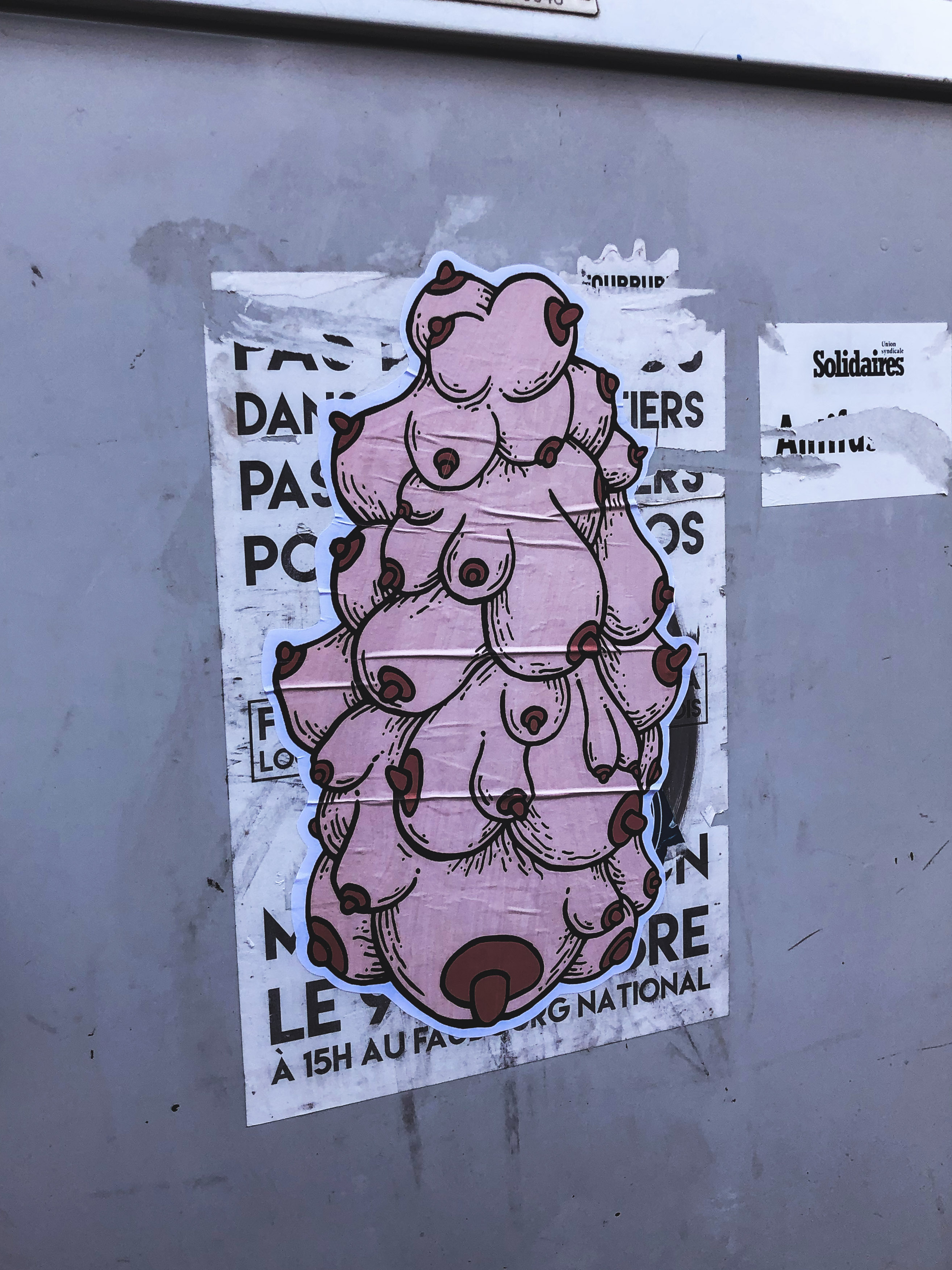 Collage Titties mountain 2020/02 - Rue des cigognes Illustration digitale imprimée et collée sur un boîtier électrique moche. 6 Rue des Cigognes, 67000 Strasbourg, France Itinéraire