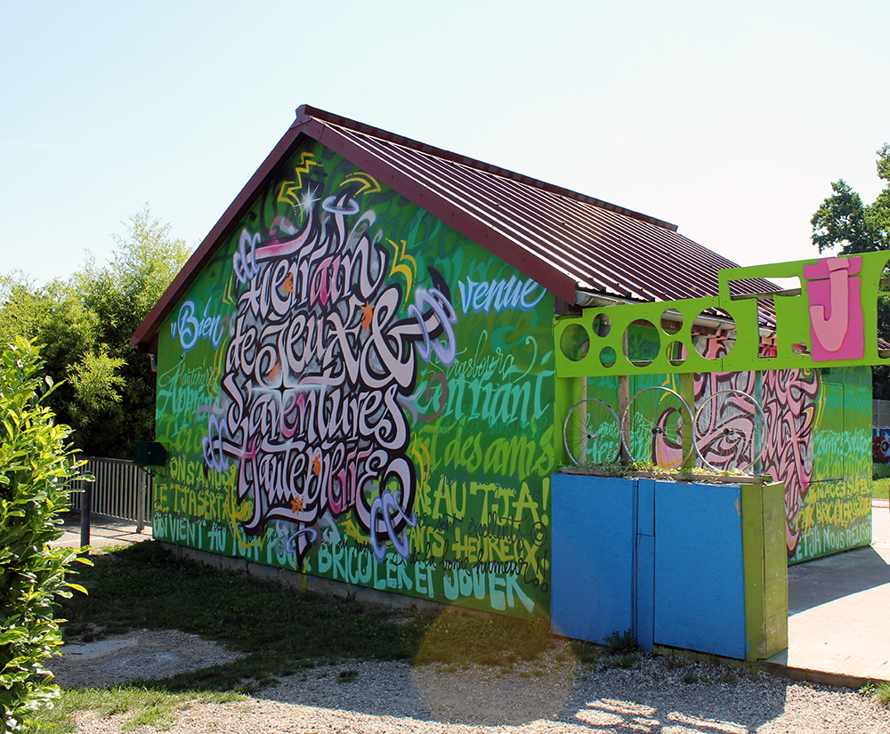 Fresques réalisées par le Studiographe sur les murs du Terrain de Jeux Et D'aventure de Hautepierre. (TJA)