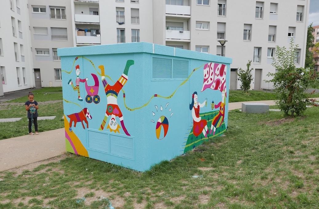 Embellissement du transformateur électrique maille Catherine à Hautepierre, Parc des frères Grimm, avec les habitants du quartier, jeunes et adolescents, en s’inspirant de l’artiste Niki de Saint Phalle.