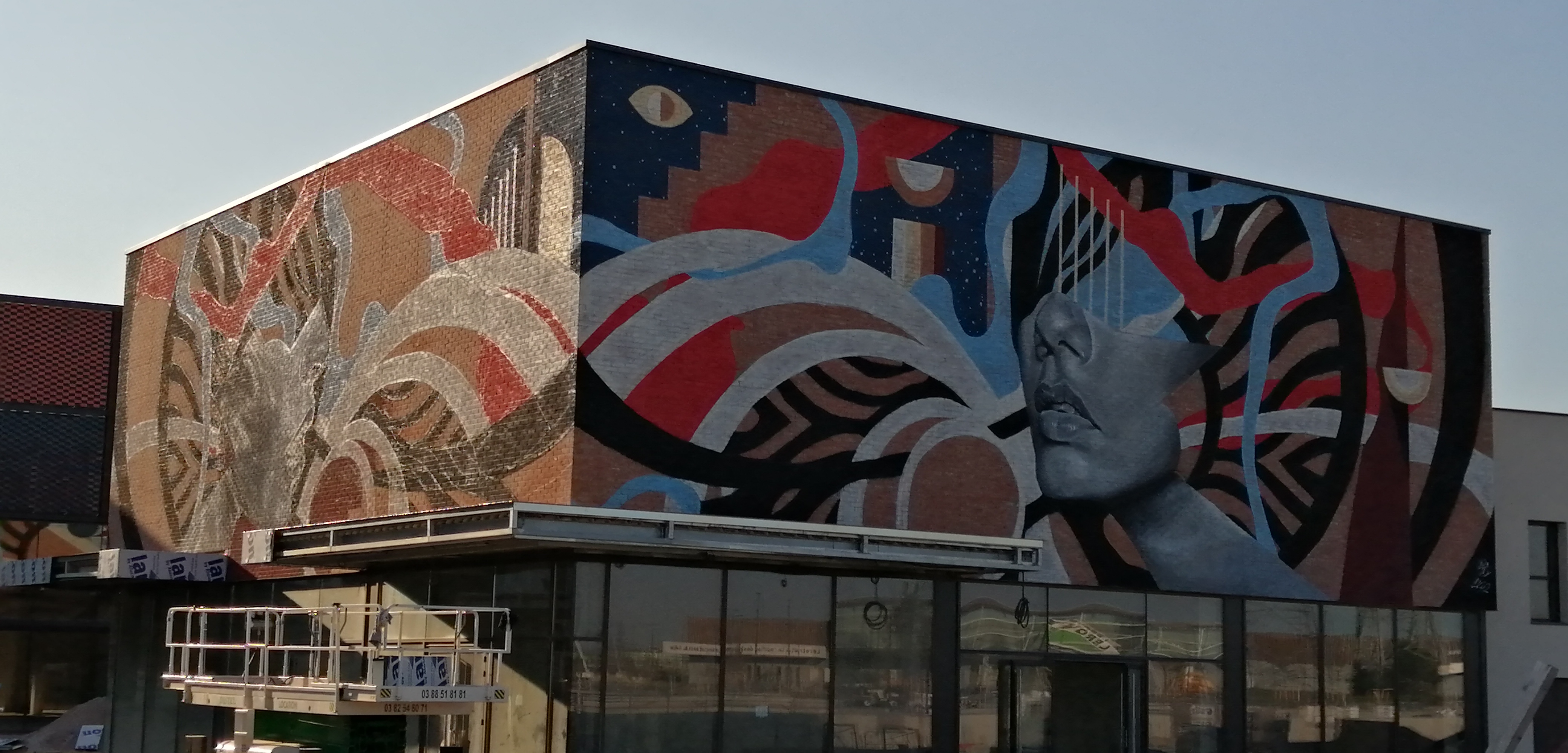 2020/09 - Extension zone commerciale de Vendenheim Fresque sur deux bandeaux supérieurs de façade en brique d'un nouveau bâtiment commercial A4, 67116 Reichstett, France Itinéraire