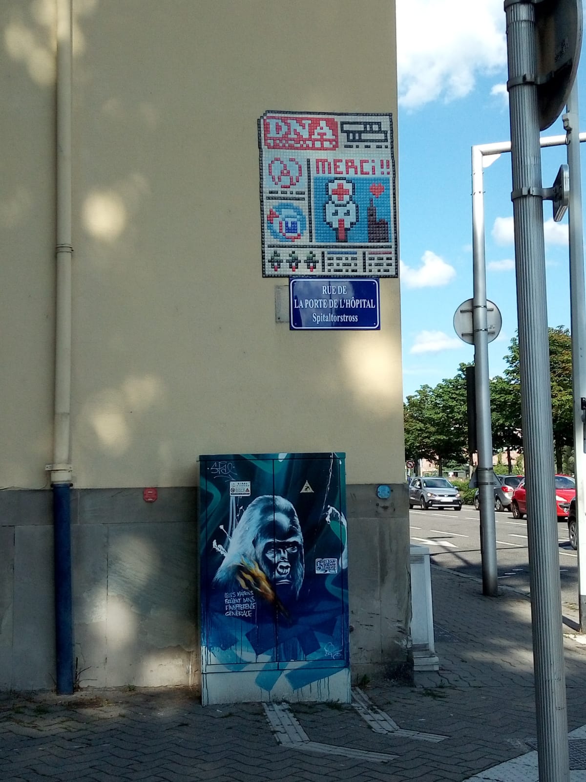 2020/06 - Rue de la Porte de l'Hopital Hommage aux soignants et à tous ceux qui ont été là pour nous signé Stork !! Hôtel de Police, 67000 Strasbourg, France Itinéraire