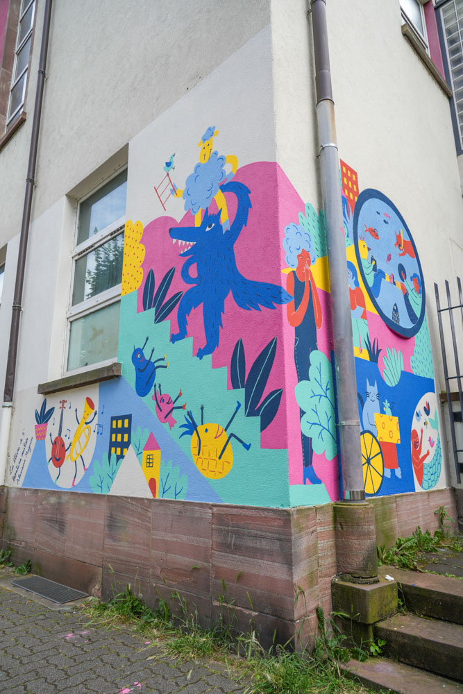 "Une fresque pensée avec les élèves de 5eme du collège pour parler du vivre ensemble. Animaux, légumes, humains, de différentes tailles, couleurs, vivent en harmonie, s’entraident, échangent."